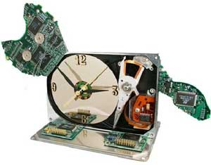 O relógio da foto utiliza componentes eletrônicos para montar a base e estrutura. As peças podem ser montadas em diversos formatos.